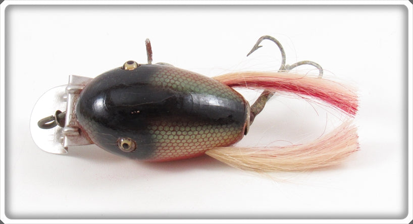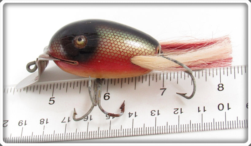 The lure is nice with a little normal wear. The box has some wear as shown, but is correctly end labeled Ding Bat Red Side No. 5105. This special order color is already super scarce but to find it with an end label box is nearly impossible! Most specials you see have stamped boxes so this is an amazing find for sure!
