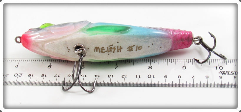 This hand carved, wooden lure is very nice and unused. It was made by Melosh Custom Baits and is one of only 25 that were made. This incredibly well made lure is amazing and scarce!