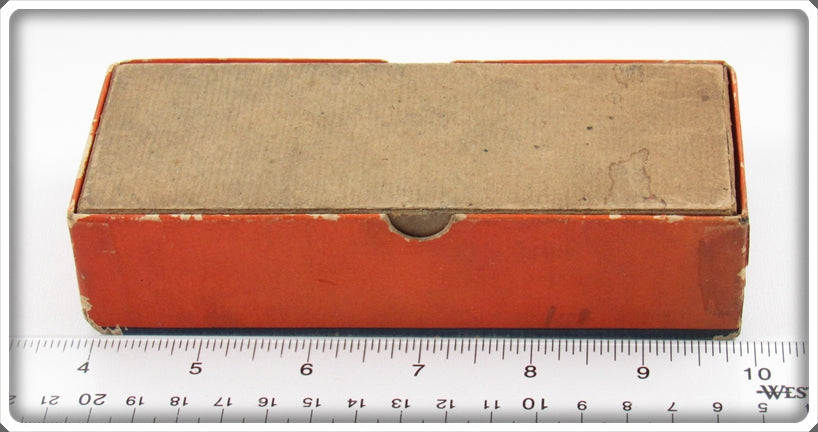 This empty box is pretty nice with a bit of expected wear. It is end labeled No. 00 FS Fancy Back Minnow Fancy Sienna, Scale Finish. This is a rarely seen box to match up with your lure!