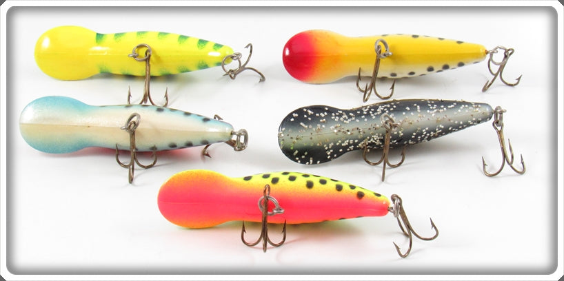 These plastic lures are very nice with light wear. I'm not sure on the age or maker but I'm guessing they are from the 1970's or so. They have really neat colors and will look great on display. It's an instant collection of whatever they are! They will be sold as a lot only.