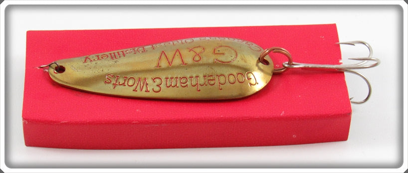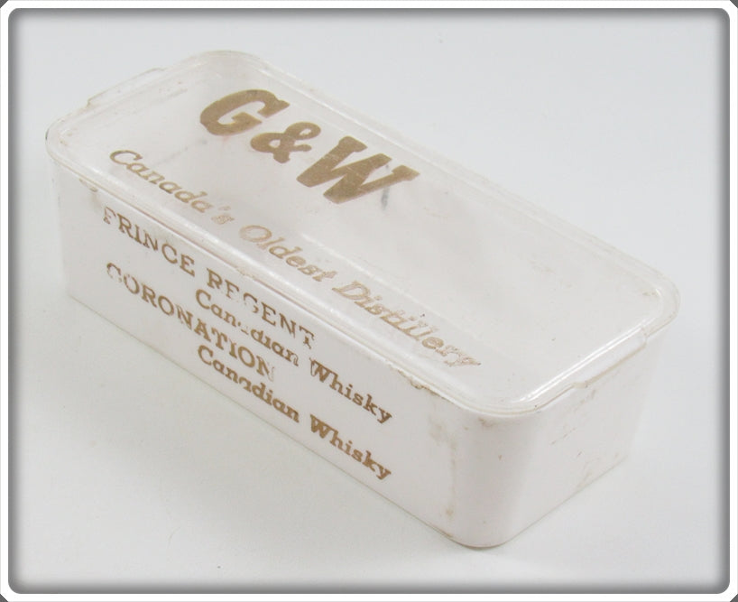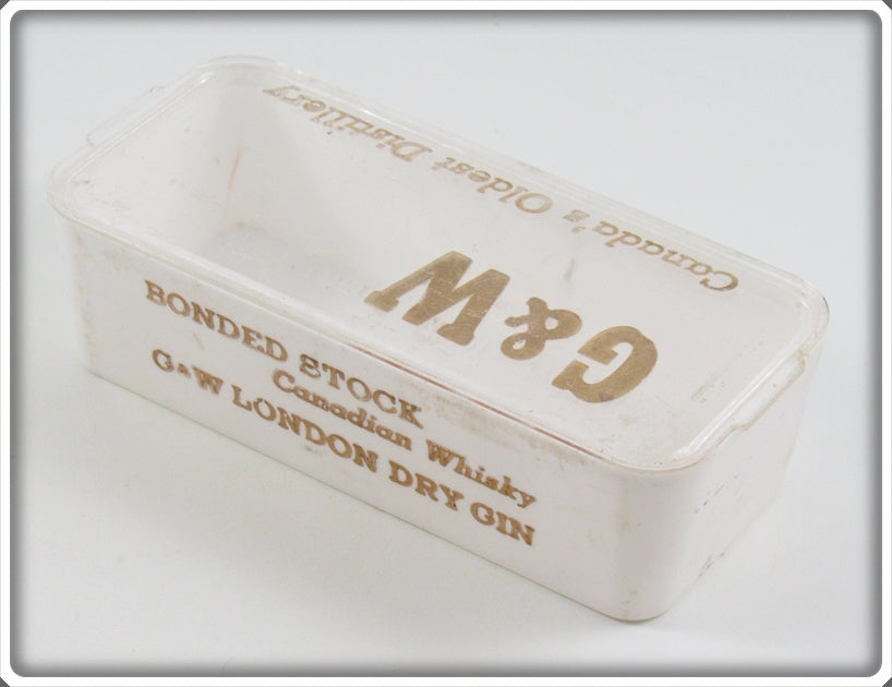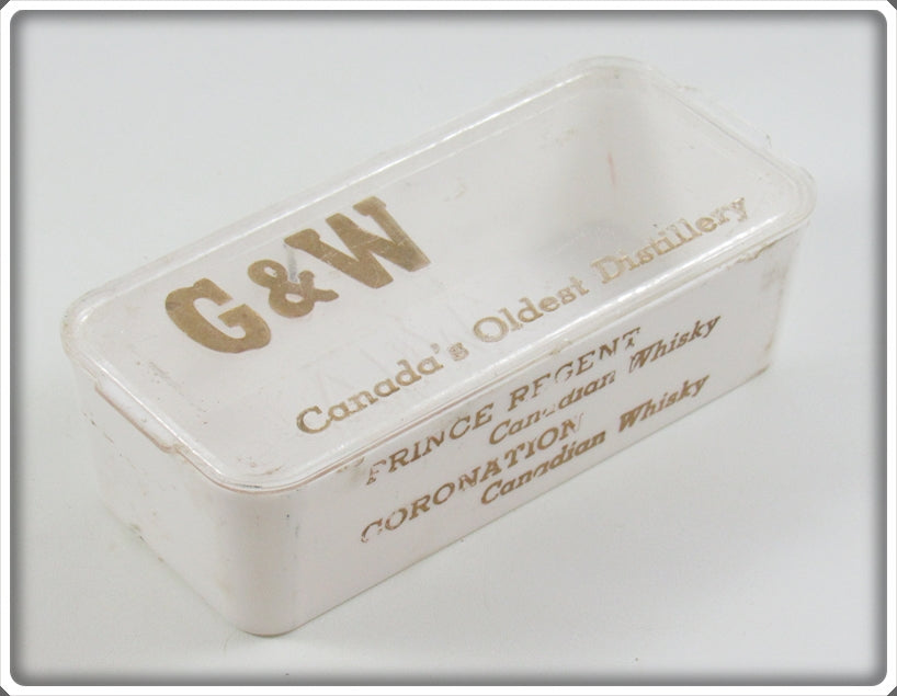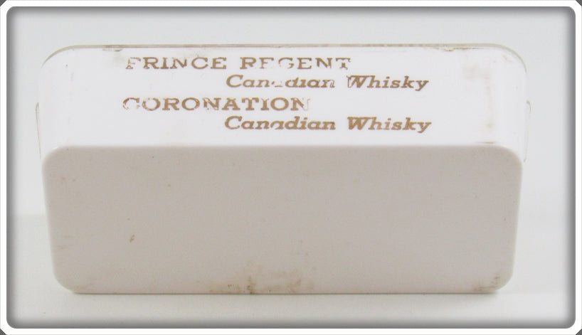The lure is nice with light age wear and it's still attached to the card. It comes with the original hard plastic box. This is a tough to find lure used to advertise Canadian Whisky!