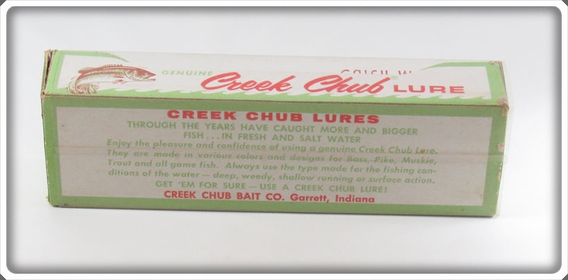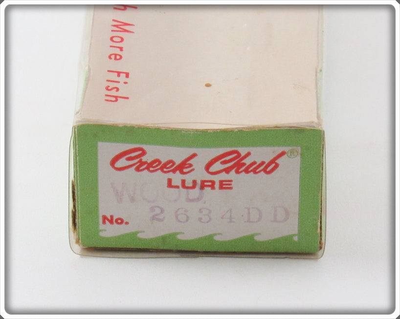 This wooden with tack eyes lure is very nice and unused. The box is correctly stamped 2634 DD. This desirable color looks great on display!
