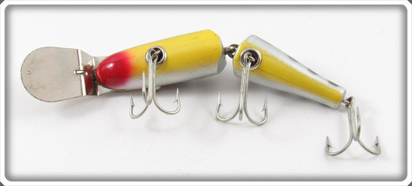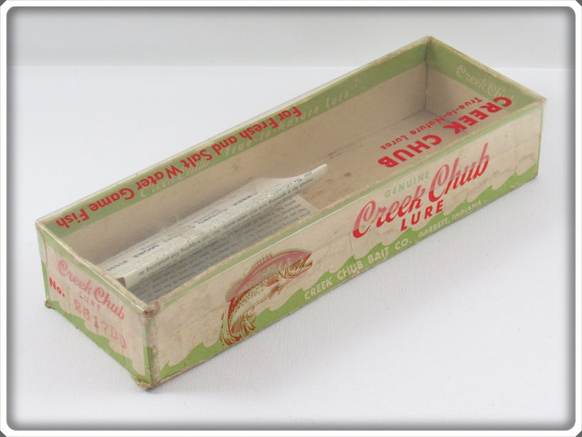 This wooden with tack eyes lure is nice with light wear. The box is correctly stamped 2617 DD. This super desirable color is so hard to find on a Jointed Pikie!