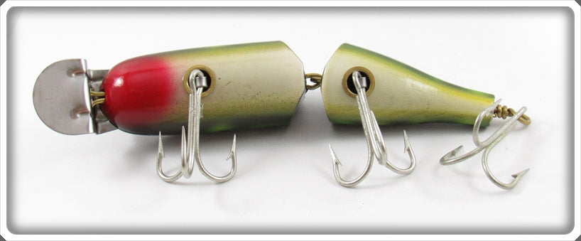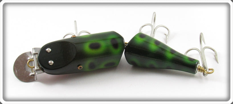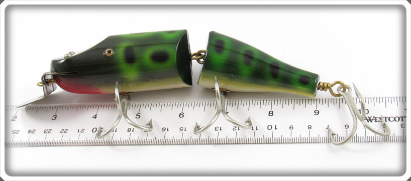 This wooden with tack eyes lure is very nice and unused. The box is correctly stamped 6819 W. Frog is a very tough to find color on a Jointed Striper Pikie!