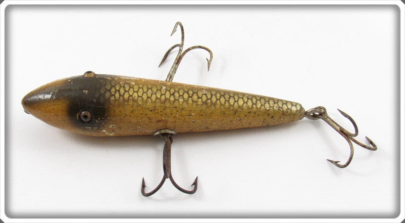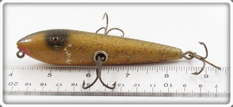 This tough lure has some honest wear as shown and it has some old over varnish on it. It's not perfect, but it still looks neat for display and is very tough to find!