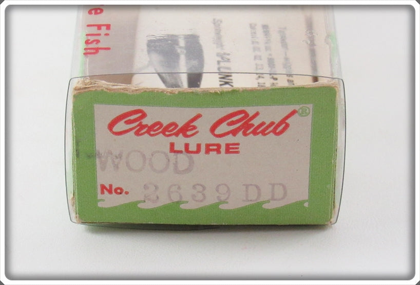 This wooden with tack eyes lure is very nice and unused. The box is correctly stamped Wood 2639 DD. This special order Tiger / Bumble Bee color is quite desirable!