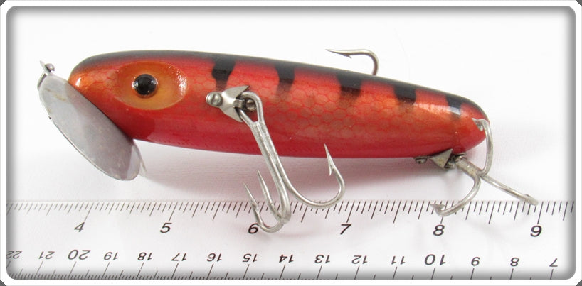 The lure is very nice and unused with light shelf wear. This flo red color is so hard to find on a wooden Musky Jitterbug!