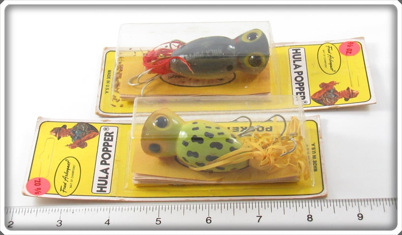 The lures are unused and still on their original cards. The Hula Poppers skirts are getting brittle and starting to shed, but they still look neat for display. This is a great group to get you started on your Arbogast collection! The price is for the lot.