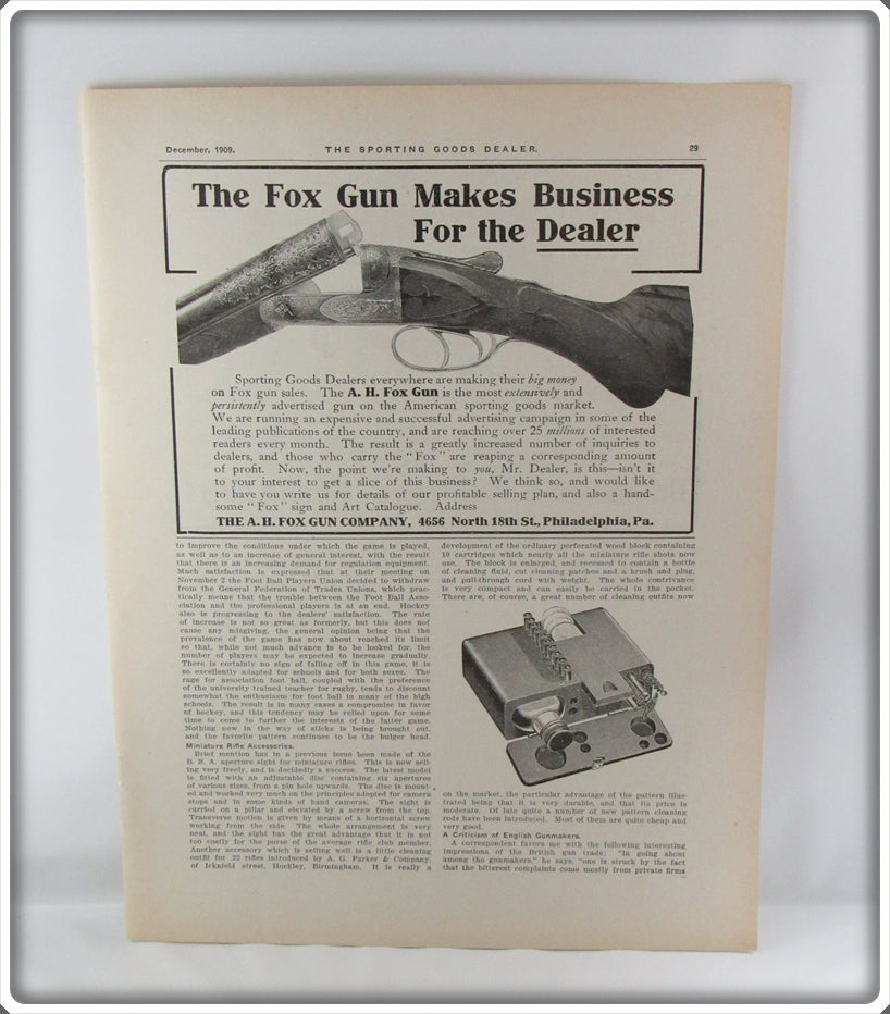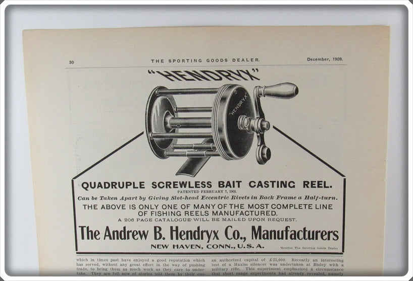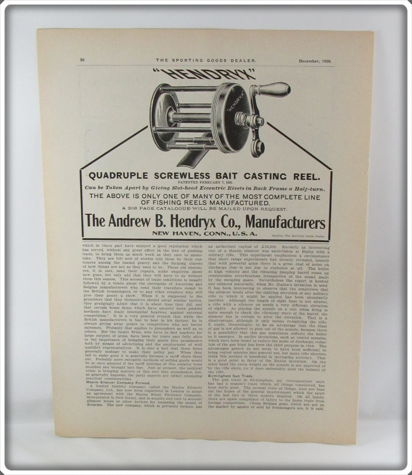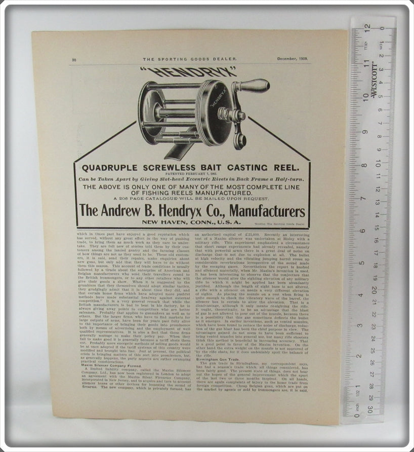 This advertisement is pretty nice with a little expected wear and some minor staple holes/damage on the edge from having been in a magazine at some point. The front of the ad is for a Hendryx Reel and the back is for a Fox Gun. This is a neat find!