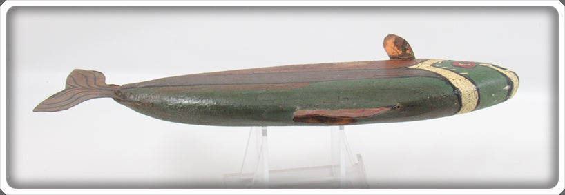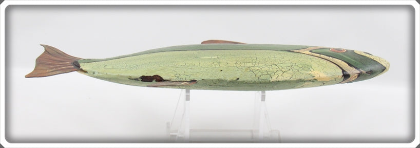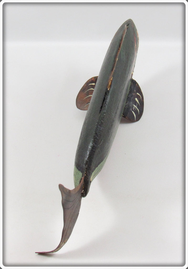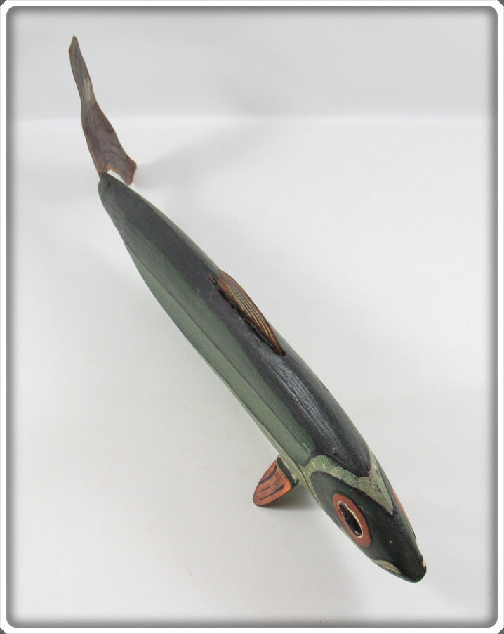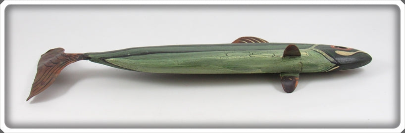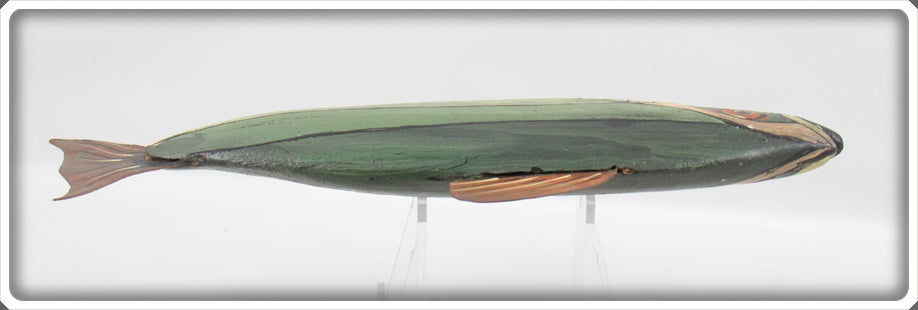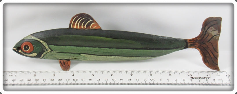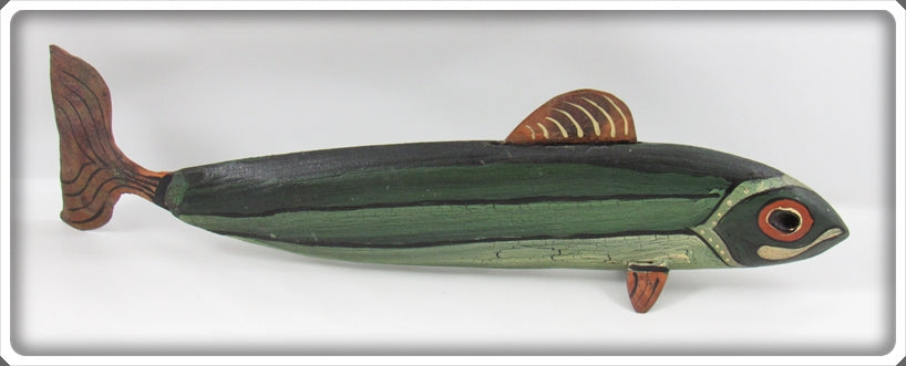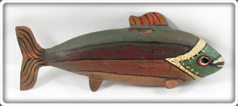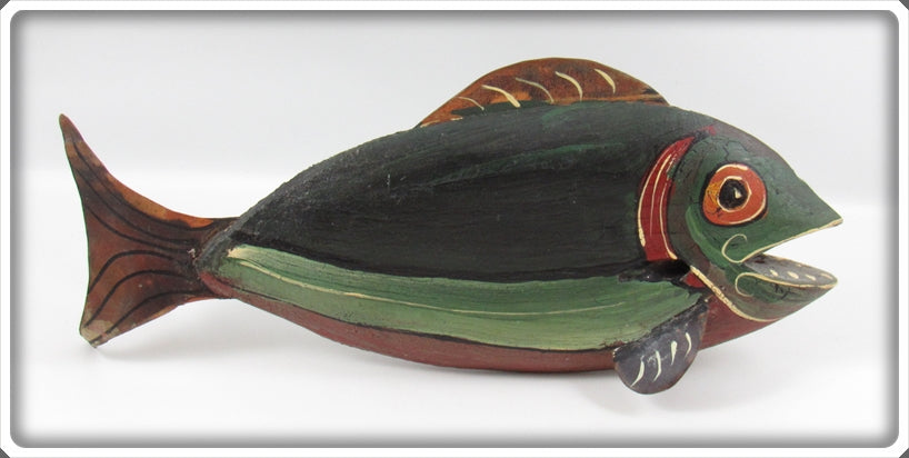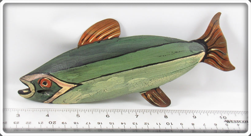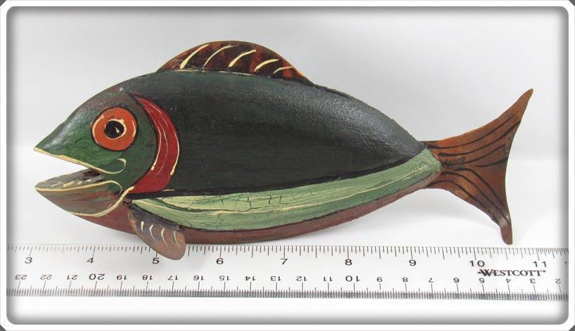 Jim Slack Contemporary Folk Art Fish Decoy/Decorative Fish Lot. Three of the decoys are nice with light wear and one is still nice, it just has a bit of paint loss on top by the fin. These were hand carved and hand painted by Jim Slack, I'm guessing maybe 20 or 30 years ago. Each of them has a hole that Jim put in them so I'm thinking these were all connected together as a set at one point. These are very tough to find! You usually see his birds he carved, but not decoys! These don't appear to have actually been made to be used as decoys and look like they would be decorative only. These are very tough to find! The price is for the lot.
