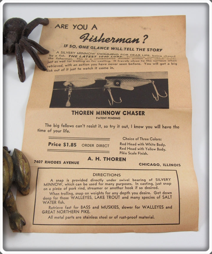 This is a nice old A. H. Thoren Green Scale Thoren Minnow Chaser lure that was sold on Tough Lures! Vintage and antique fishing lures are added for sale often so keep checking back! I buy old lures so feel free to contact me if you have any to sell.
