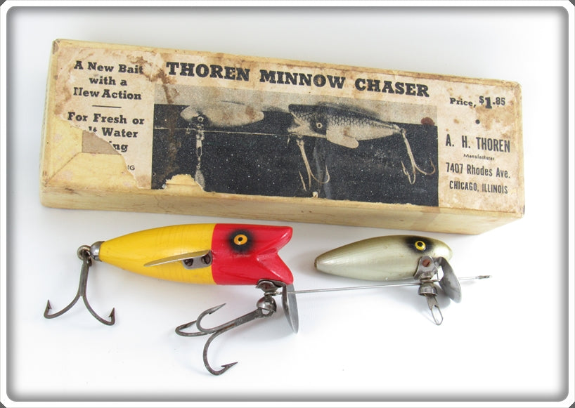 This is a nice old AH Thoren Mfg Co Thoren's Minnow Chaser lure that was sold on Tough Lures! Vintage and antique fishing lures are added for sale often so keep checking back! I buy old lures so feel free to contact me if you have any to sell.