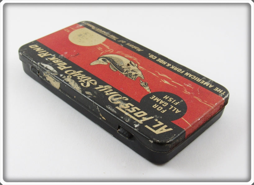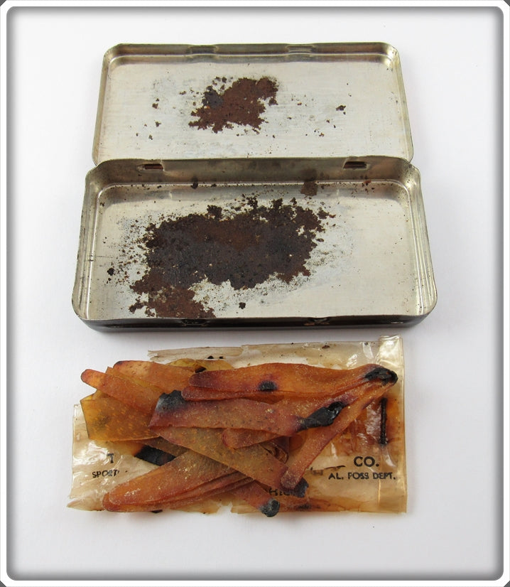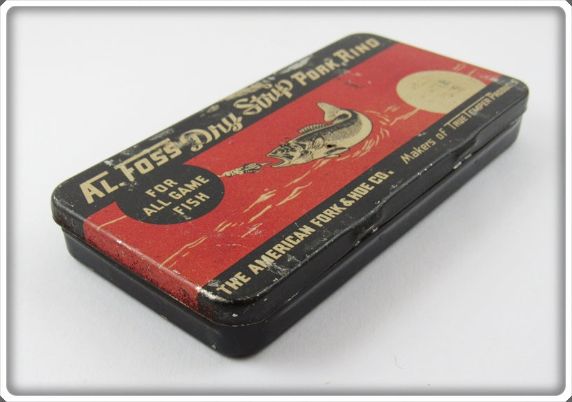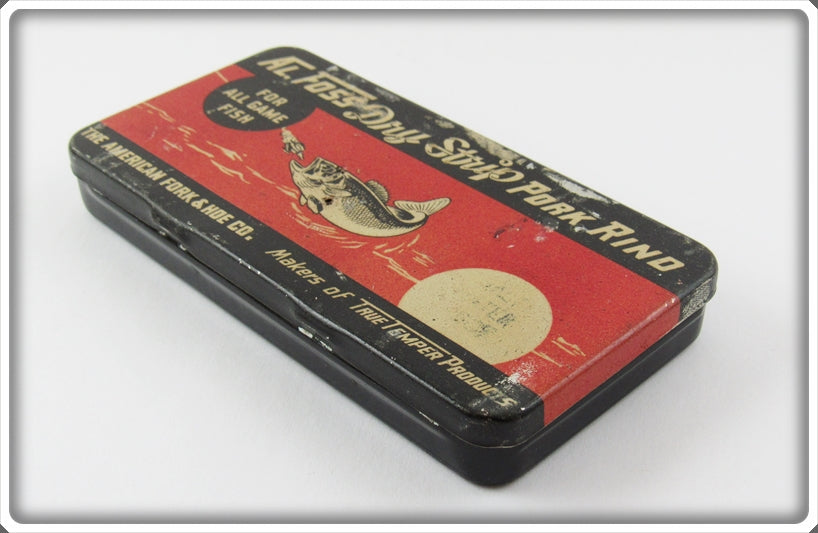 This is a nice old Al Foss Dry Strip Pork Rind Tin that was sold on Tough Lures! Vintage and antique fishing lures are added for sale often so keep checking back! I buy old lures so feel free to contact me if you have any to sell.