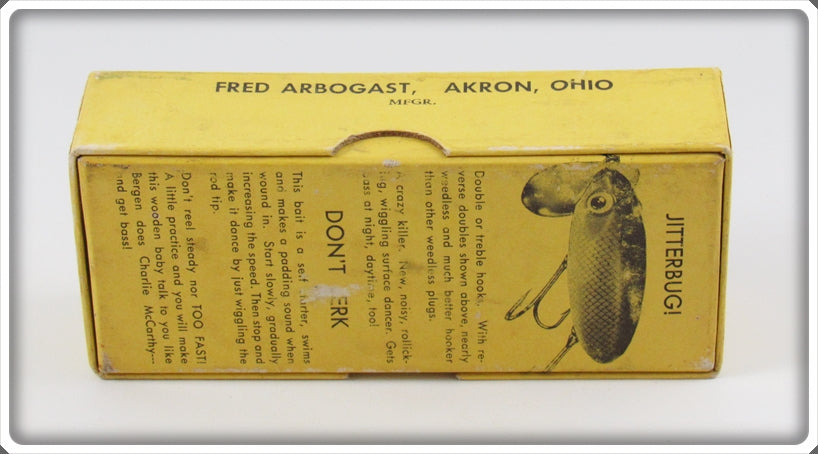 This is a nice old Arbogast Black Wooden Jitterbug In Cellophane Lid Box that was sold on Tough Lures! Vintage and antique fishing lures are added for sale often so keep checking back! I buy old lures so feel free to contact me if you have any to sell.