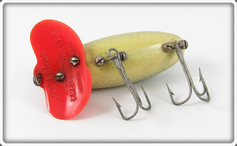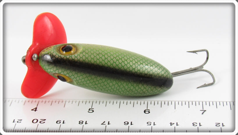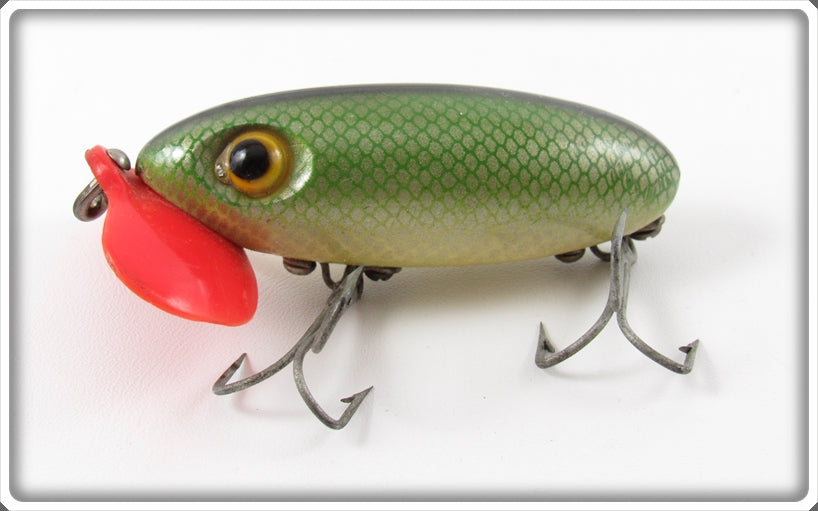 This is a nice old Fred Arbogast Green Scale Plastic Lip WW2 Jitterbug lure that was sold on Tough Lures! Vintage and antique fishing lures are added for sale often so keep checking back! I buy old lures so feel free to contact me if you have any to sell.
