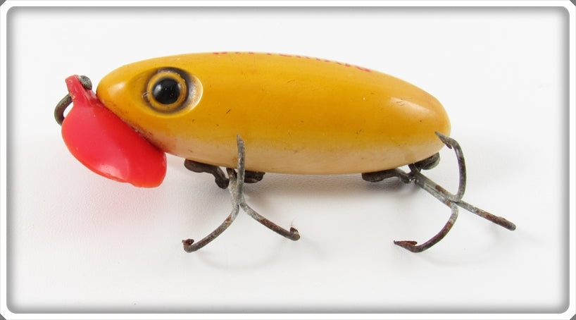 This is a nice old Fred Arbogast Yellow White Belly Plastic Lip WW2 Jitterbug lure that was sold on Tough Lures! Vintage and antique fishing lures are added for sale often so keep checking back! I buy old lures so feel free to contact me if you have any to sell.