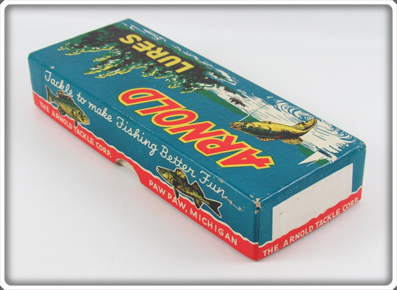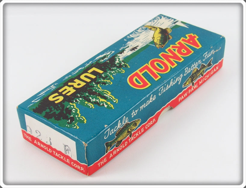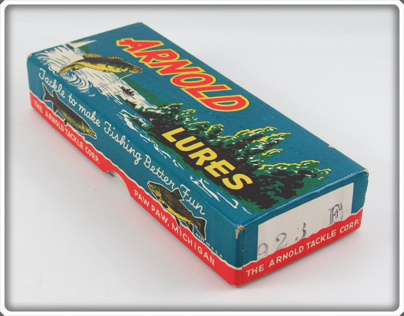 This is a nice old The Arnold Tackle Corp Fluorescent Red Fire Plug Wounded Minnow lure # 923 F that was sold on Tough Lures! Vintage and antique fishing lures are added for sale often so keep checking back! I buy old lures so feel free to contact me if you have any to sell.