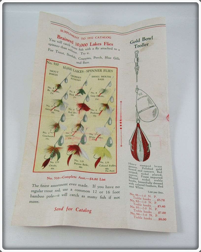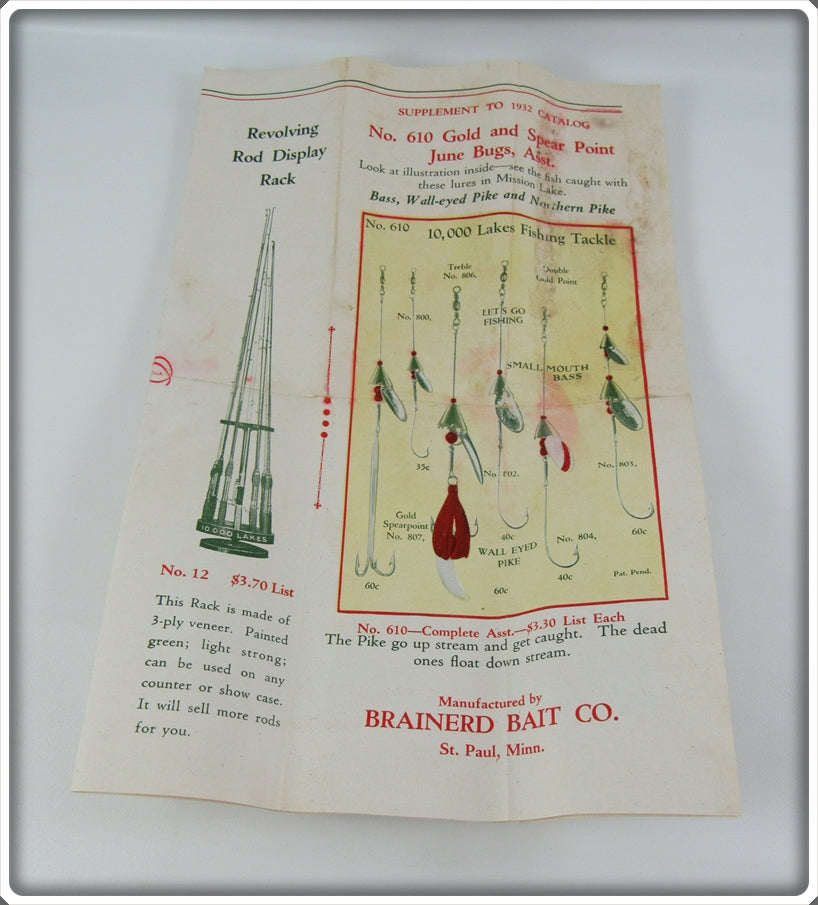This is a nice old Brainerd Bait Company 10,000 Lakes Fishing Tackle Saint Paul Minn Br. Gold Cap Dodger lure # 193 that was sold on Tough Lures! Vintage and antique fishing lures are added for sale often so keep checking back! I buy old lures so feel free to contact me if you have any to sell.