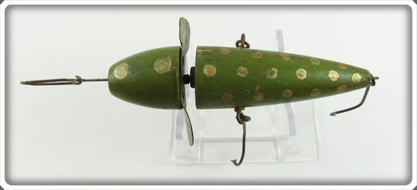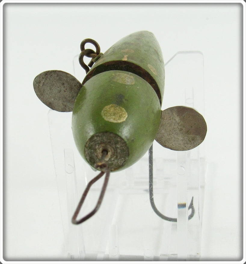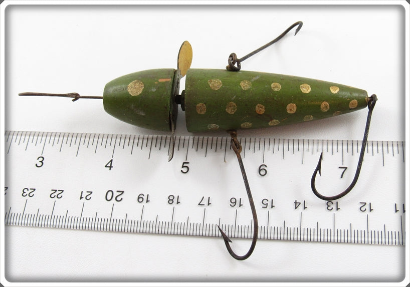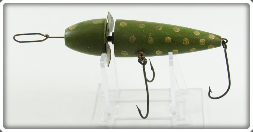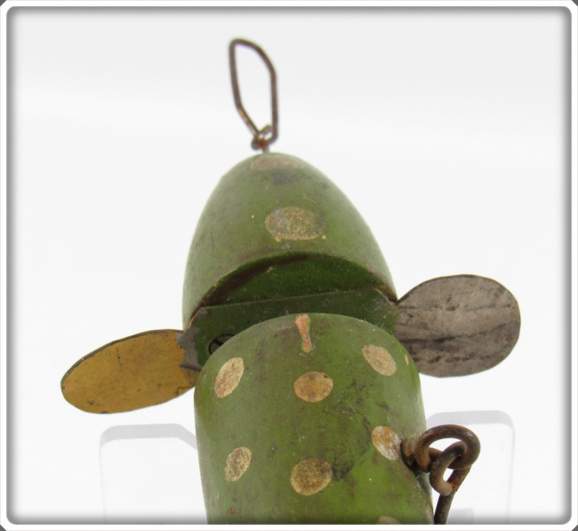 This is a nice old Charles Bennington Green & Gold Spotted lure that was sold on Tough Lures! Vintage and antique fishing lures are added for sale often so keep checking back! I buy old lures so feel free to contact me if you have any to sell.