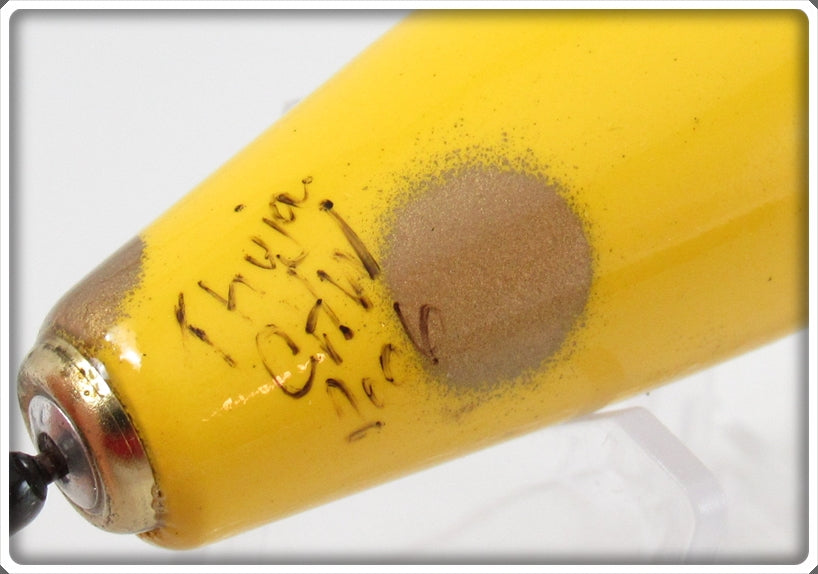 This is a nice old Charlie Wepfer Yellow Gold Spots Thuja Rotary Head lure that was sold on Tough Lures! Vintage and antique fishing lures are added for sale often so keep checking back! I buy old lures so feel free to contact me if you have any to sell.