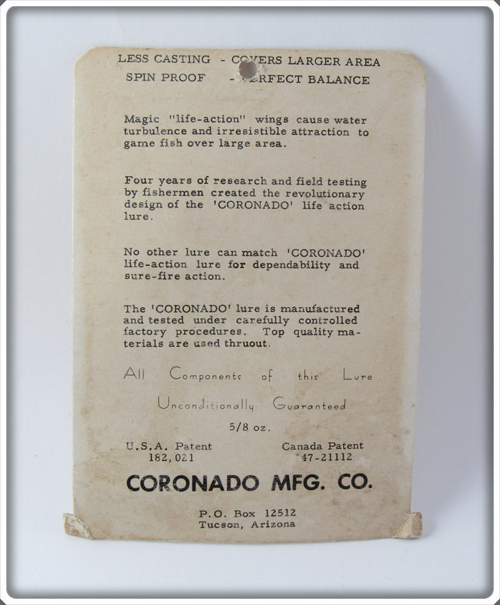 This is a nice old Coronado Mfg Co Dragon Fly lure that was sold on Tough Lures! Vintage and antique fishing lures are added for sale often so keep checking back! I buy old lures so feel free to contact me if you have any to sell.