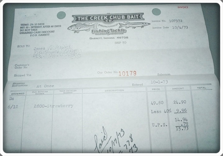 Creek Chub Bait Company Invoice For Strawberry Spotted Triple Jointed Pikies
