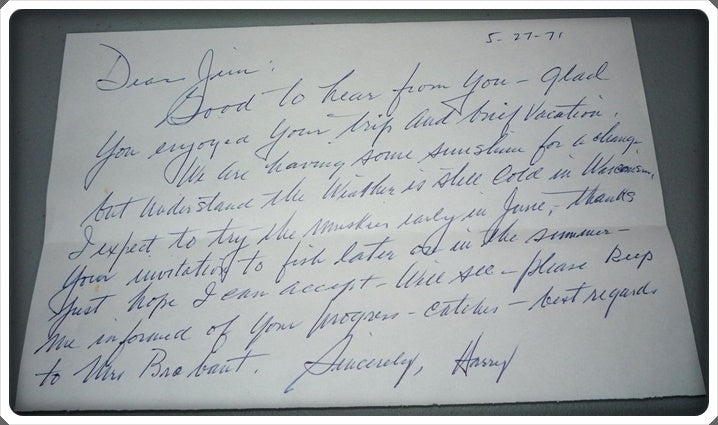 Creek Chub Bait Company Signed Letter From Harry Heinzerling