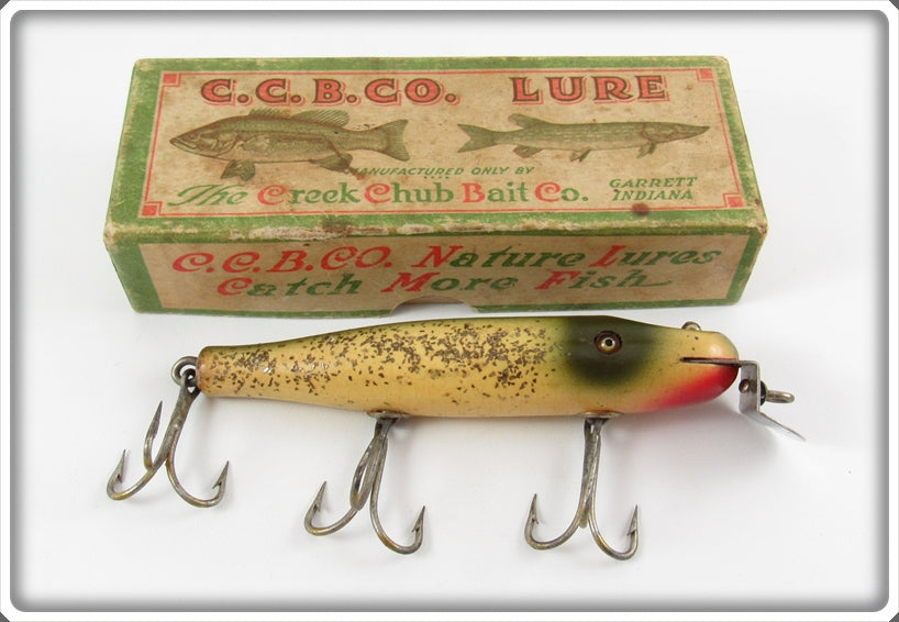 This is a nice old C.C.B.CO The Creek Chub Bait Co Day N Nite Glow In The Dark Pikie lure # 721 that was sold on Tough Lures! Vintage and antique fishing lures are added for sale often so keep checking back! I buy old lures so feel free to contact me if you have any to sell.