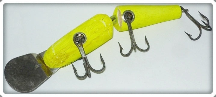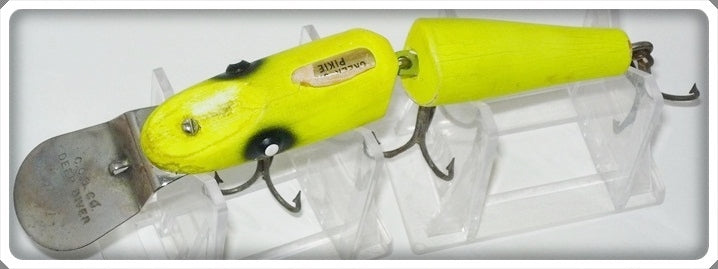 This is a nice old Creek Chub Fluorescent Yellow Deep Diving Jointed Pikie lure # 2623 DD Special or 2600 FY that was sold on Tough Lures! Vintage and antique fishing lures are added for sale often so keep checking back! I buy old lures so feel free to contact me if you have any to sell.