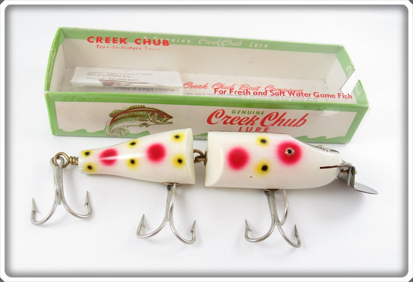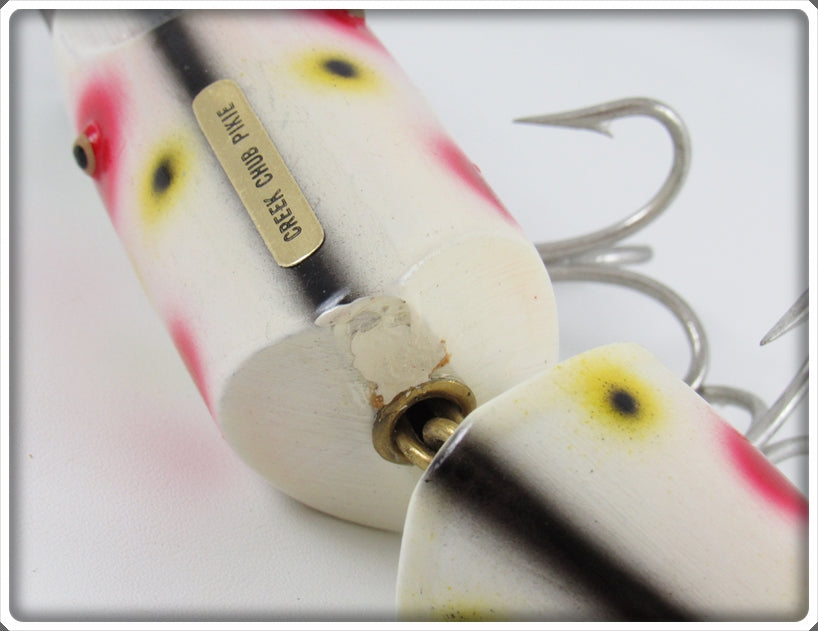 This is a nice old Creek Chub Strawberry Jointed Striper Pikie lure # 6843 W Special that was sold on Tough Lures! Vintage and antique fishing lures are added for sale often so keep checking back! I buy old lures so feel free to contact me if you have any to sell.