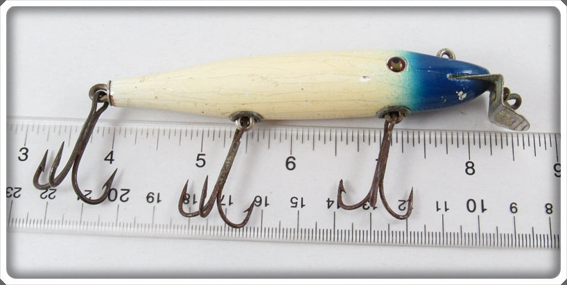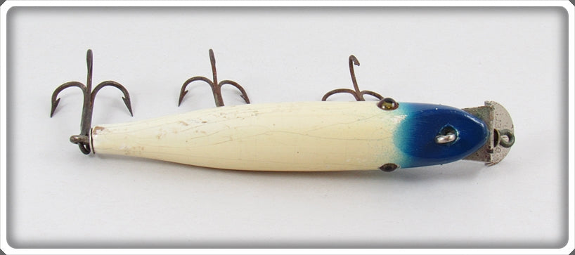 This is a nice old C.C.B.CO. The Creek Chub Bait Company White With Blended Blue Head Pikie lure # 710 Special that was sold on Tough Lures! Vintage and antique fishing lures are added for sale often so keep checking back! I buy old lures so feel free to contact me if you have any to sell.