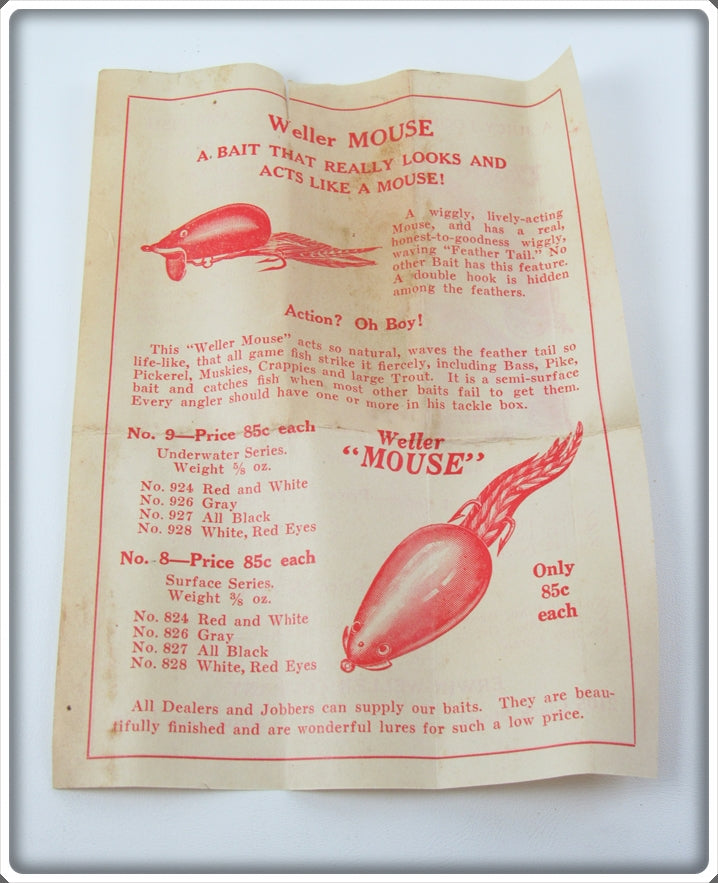 This is a nice old Erwin Weller Company Red & White Weller Mouse lure that was sold on Tough Lures! Vintage and antique fishing lures are added for sale often so keep checking back! I buy old lures so feel free to contact me if you have any to sell.