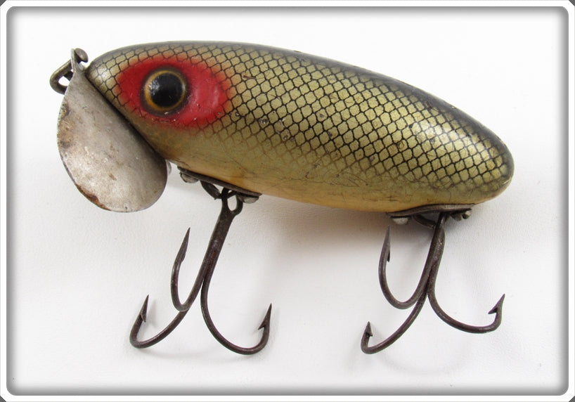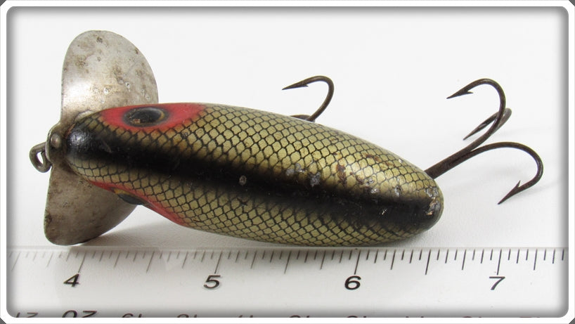 This is a nice old Fred Arbogast Black Silver Scale Jitterbug lure that was sold on Tough Lures! Vintage and antique fishing lures are added for sale often so keep checking back! I buy old lures so feel free to contact me if you have any to sell.