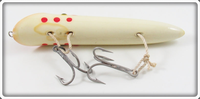 This is a nice old Harris White Red Dot Size 5 Salmon Plug lure that was sold on Tough Lures! Vintage and antique fishing lures are added for sale often so keep checking back! I buy old lures so feel free to contact me if you have any to sell.