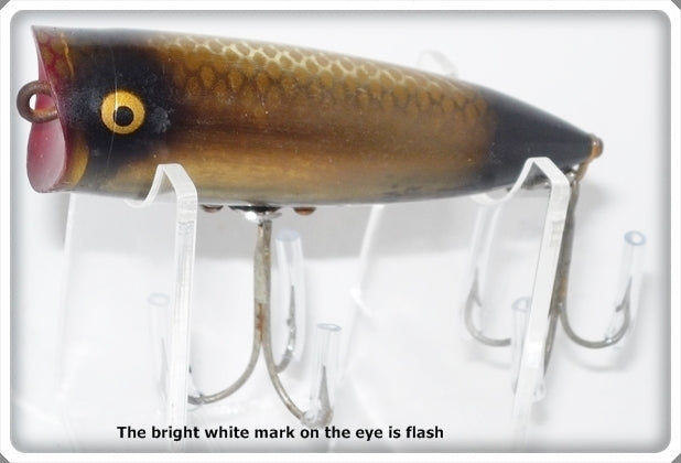 This is a nice old Heddon Black & Gold Fish Flash Chugger Spook lure # FF9540GB that was sold on Tough Lures! Vintage and antique fishing lures are added for sale often so keep checking back! I buy old lures so feel free to contact me if you have any to sell.