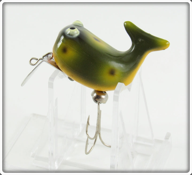This is a nice old Heddon Frog Black Eye Shadow Hi Tail lure # 305F that was sold on Tough Lures! Vintage and antique fishing lures are added for sale often so keep checking back! I buy old lures so feel free to contact me if you have any to sell.