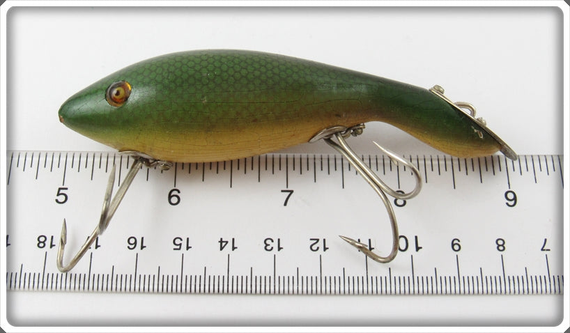 This is a nice old Heddon Green Scale Tadpolly lure # 5009D that was sold on Tough Lures! Vintage and antique fishing lures are added for sale often so keep checking back! I buy old lures so feel free to contact me if you have any to sell.