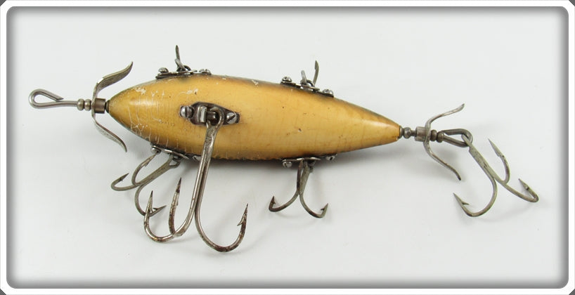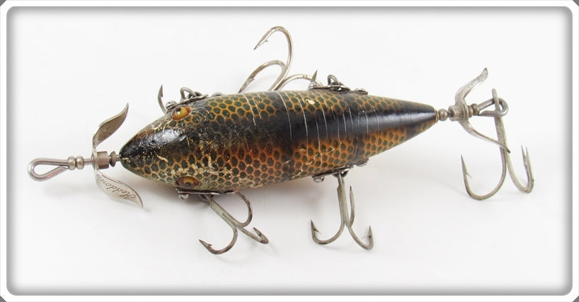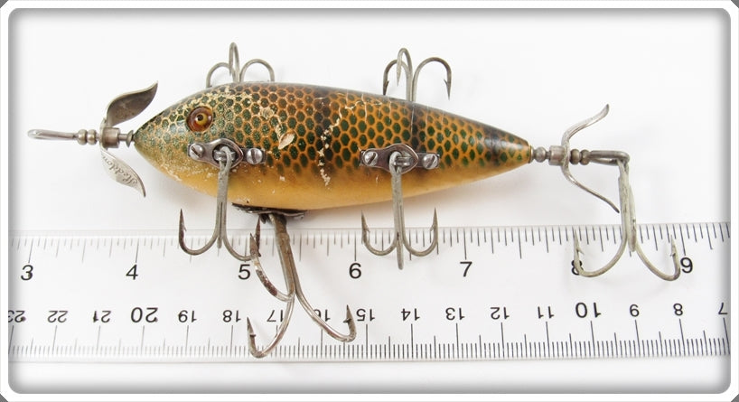 This is a nice old Heddon Pike Scale Six Hook Musky Minnow lure # 309M that was sold on Tough Lures! Vintage and antique fishing lures are added for sale often so keep checking back! I buy old lures so feel free to contact me if you have any to sell.