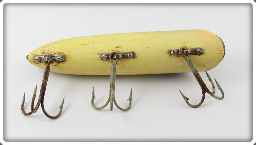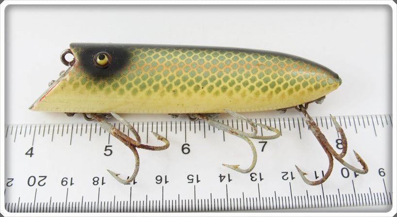 This is a nice old Heddon Shiner Scale Saltwater Basser lure # S8509P that was sold on Tough Lures! Vintage and antique fishing lures are added for sale often so keep checking back! I buy old lures so feel free to contact me if you have any to sell.
