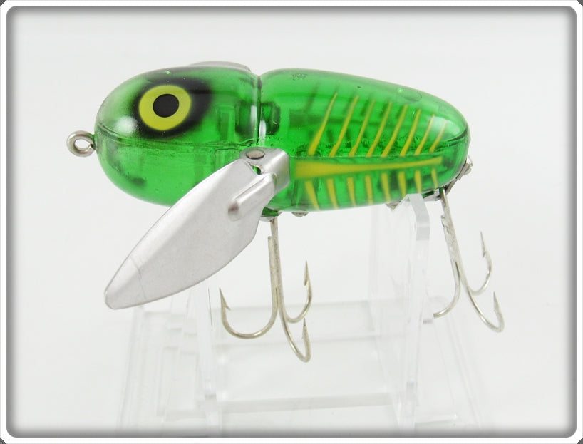 This is a nice old Heddon Spook Glow Green With Yellow Shore Crazy Crawler lure that was sold on Tough Lures! Vintage and antique fishing lures are added for sale often so keep checking back! I buy old lures so feel free to contact me if you have any to sell.