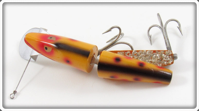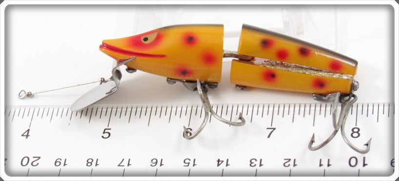 This is a nice old Heddon Spotted Orange Scissor Tail 9830 SO lure that was sold on Tough Lures! Vintage and antique fishing lures are added for sale often so keep checking back! I buy old lures so feel free to contact me if you have any to sell.