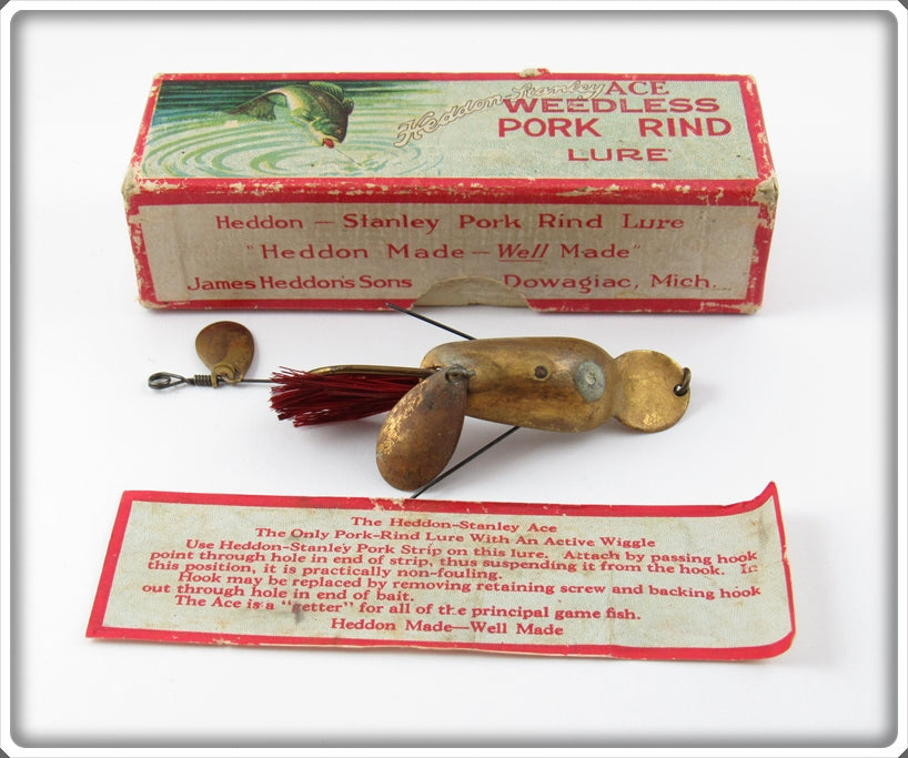 This is a nice old Heddon Weedless Ace Stanley lure # 190 GP that was sold on Tough Lures! Vintage and antique fishing lures are added for sale often so keep checking back! I buy old lures so feel free to contact me if you have any to sell.