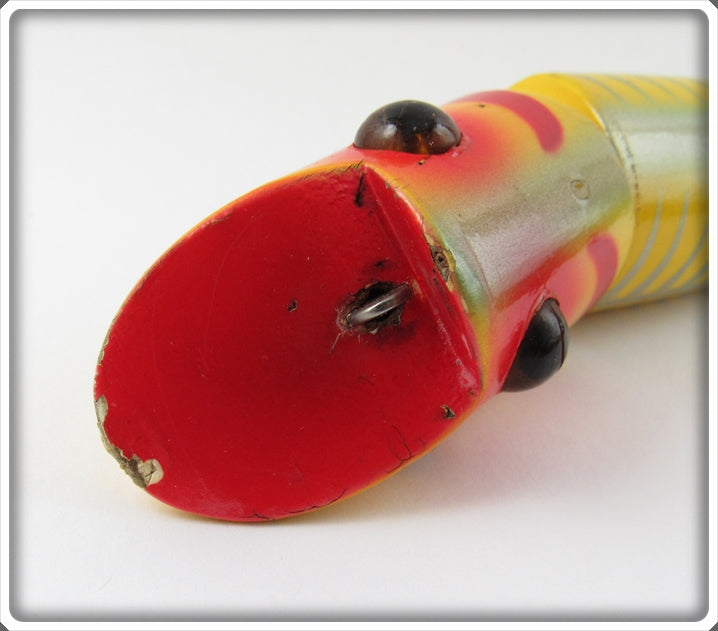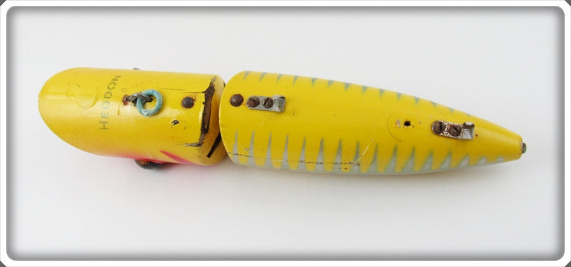 This is a nice old Heddon Yellow Shore Salmon King Zig Wag lure # 8369 XRY that was sold on Tough Lures! Vintage and antique fishing lures are added for sale often so keep checking back! I buy old lures so feel free to contact me if you have any to sell.