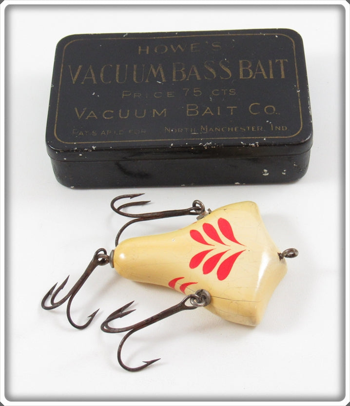 This is a nice old Howe's Red & White Vacuum Bass Bait lure that was sold on Tough Lures! Vintage and antique fishing lures are added for sale often so keep checking back! I buy old lures so feel free to contact me if you have any to sell.
