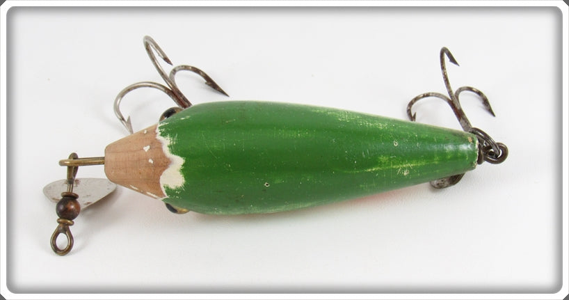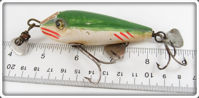 This is a nice old James L Donaly Green & White Red Fin Minnow lure that was sold on Tough Lures! Vintage and antique fishing lures are added for sale often so keep checking back! I buy old lures so feel free to contact me if you have any to sell.
