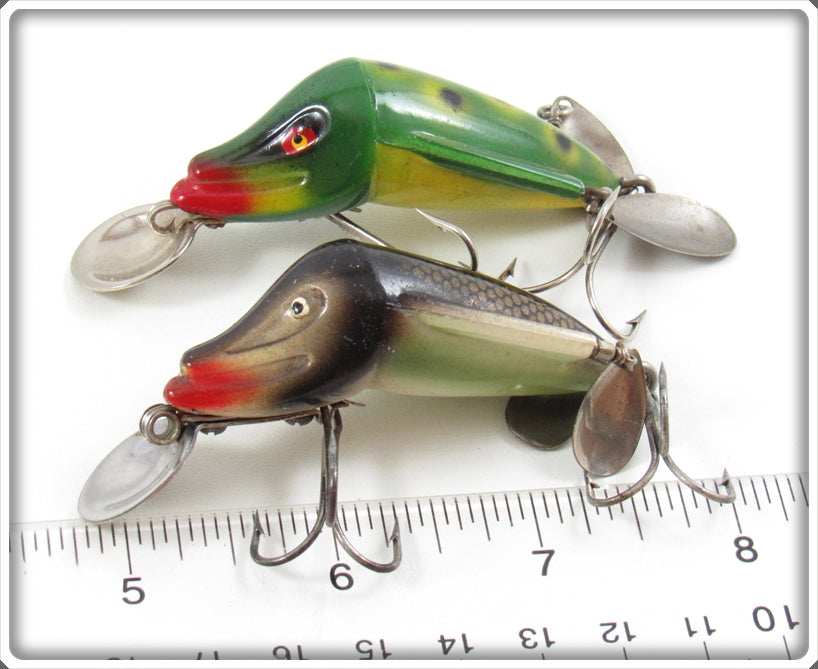 This is a nice old Jamison Frog and Natural Chub Wig L Twin lure pair that was sold on Tough Lures! Vintage and antique fishing lures are added for sale often so keep checking back! I buy old lures so feel free to contact me if you have any to sell.