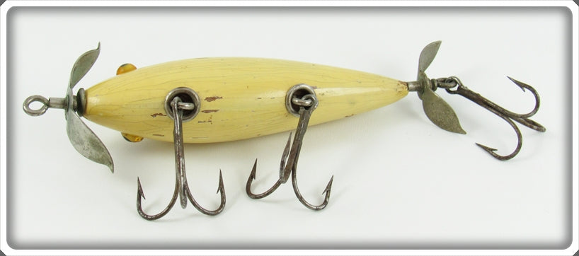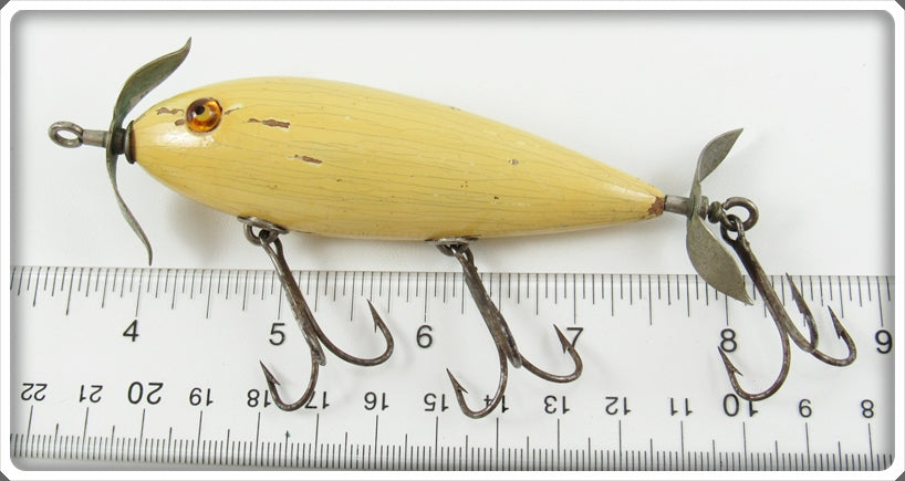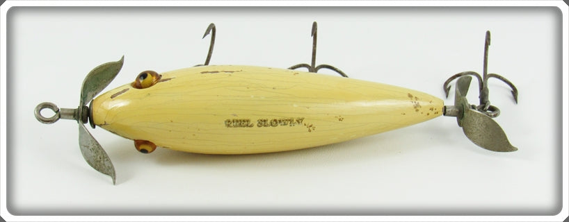 This is a nice old Kostielny Bait Co White Reel Slowly Minnow lure that was sold on Tough Lures! Vintage and antique fishing lures are added for sale often so keep checking back! I buy old lures so feel free to contact me if you have any to sell.