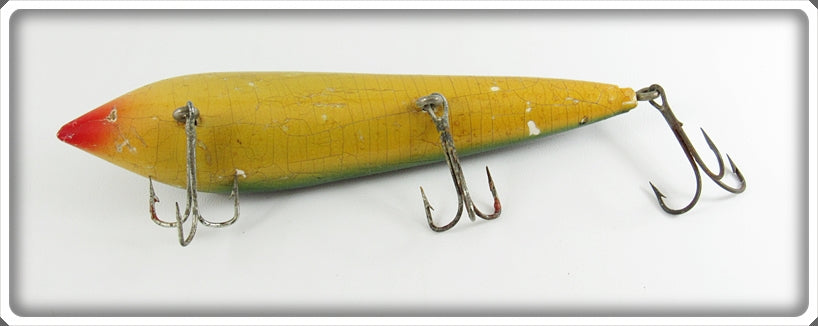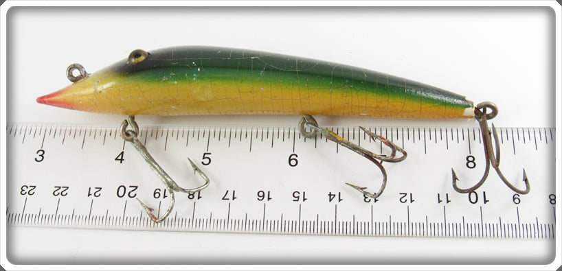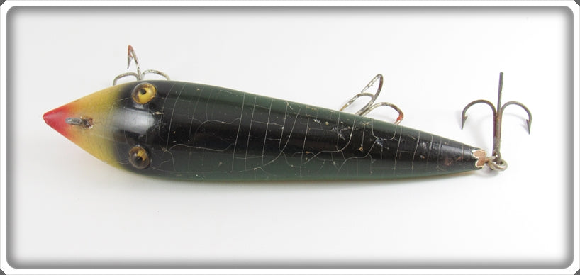 This is a nice old Moonlight Green & Black Musky Pikaroon lure that was sold on Tough Lures! Vintage and antique fishing lures are added for sale often so keep checking back! I buy old lures so feel free to contact me if you have any to sell.