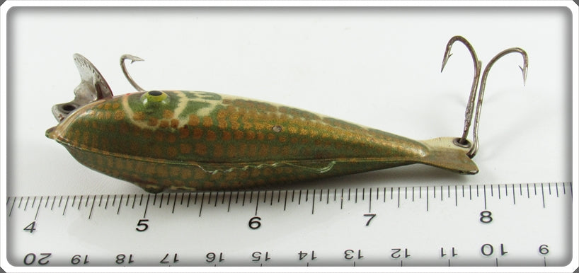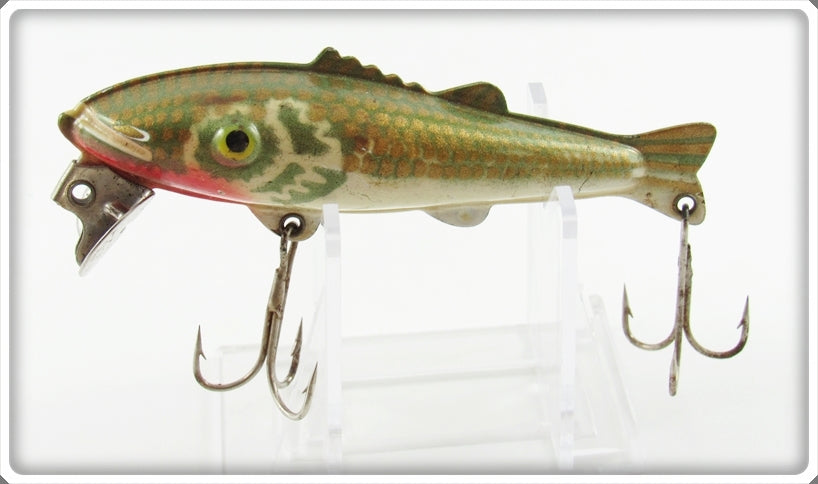This is a nice old Outing Mfg Co Green & Gold Scale Bassy Getum lure that was sold on Tough Lures! Vintage and antique fishing lures are added for sale often so keep checking back! I buy old lures so feel free to contact me if you have any to sell.