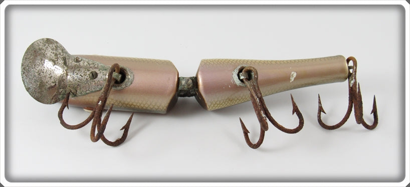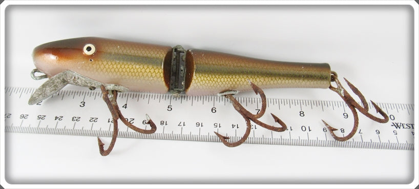 This is a nice old Paw Paw Shiner Scale Jointed Dreadnought lure # 5100 SJ that was sold on Tough Lures! Vintage and antique fishing lures are added for sale often so keep checking back! I buy old lures so feel free to contact me if you have any to sell.